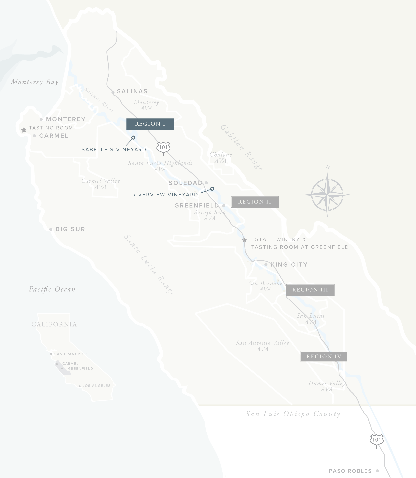 Designated by our mineral blue label, this is a cool climate area of northern Monterey County, where the morning fog often lingers until mid-day. The coolest of our growing regions, it is known for producing elegant, layered wines of delicacy and balance and is the ideal spot for ultra-premium Chardonnay and Pinot Noir. The Chardonnay displays a flinty, mineral character, revealing a Burgundian flavor profile. The Pinot Noir is typified by vibrant red fruit, complexity and a lush quality.